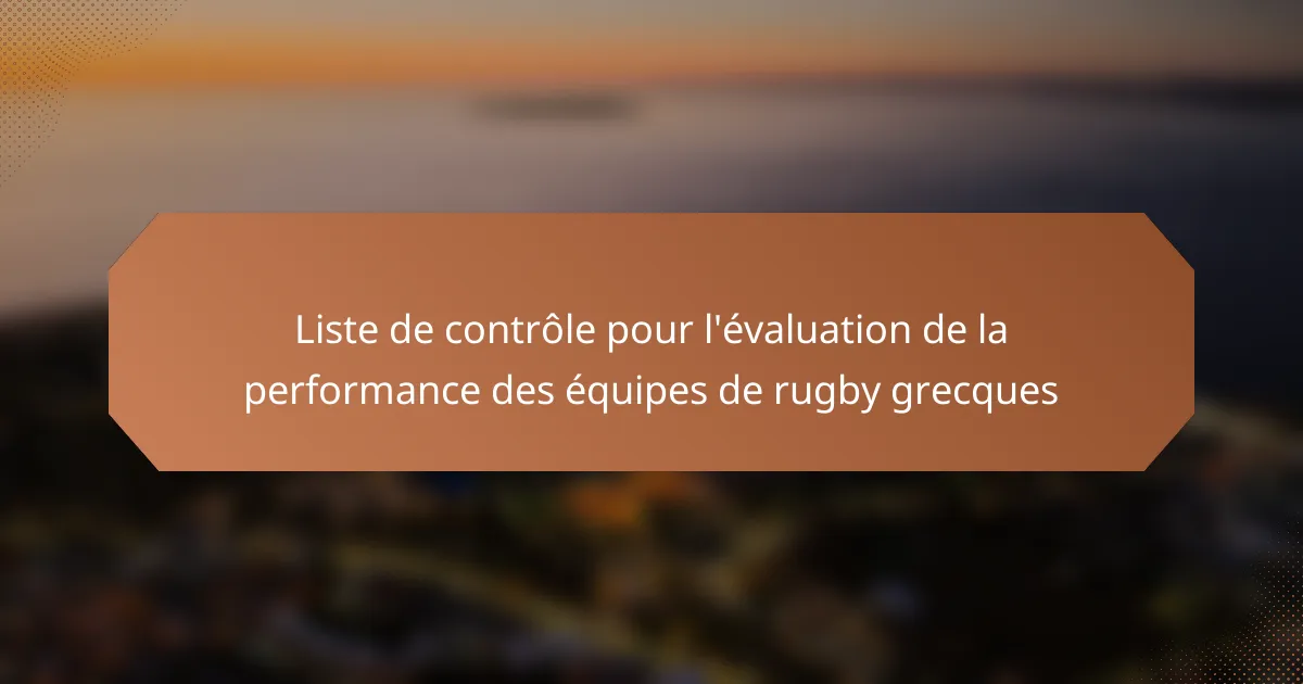 La liste de contrôle pour l’évaluation de la performance des équipes de rugby grecques est essentielle pour identifier les forces et les faiblesses au sein de l’équipe. En se concentrant sur des indicateurs clés de performance tels que la condition physique des joueurs, la dynamique d’équipe et la qualité de l’entraînement, les équipes peuvent améliorer stratégiquement leur performance globale. Cette approche complète garantit que les joueurs sont non seulement compétents, mais aussi physiquement et mentalement préparés à la compétition.
